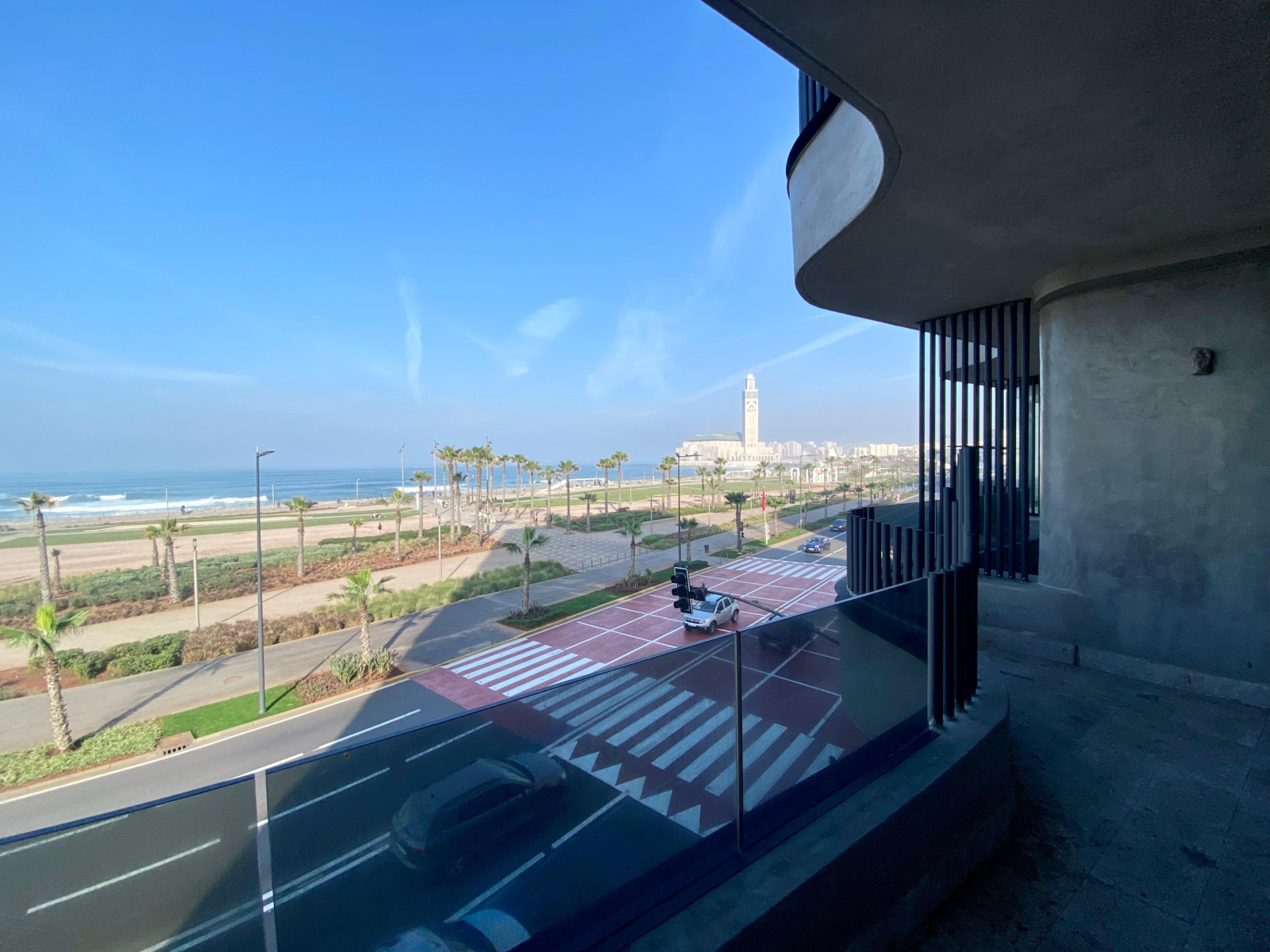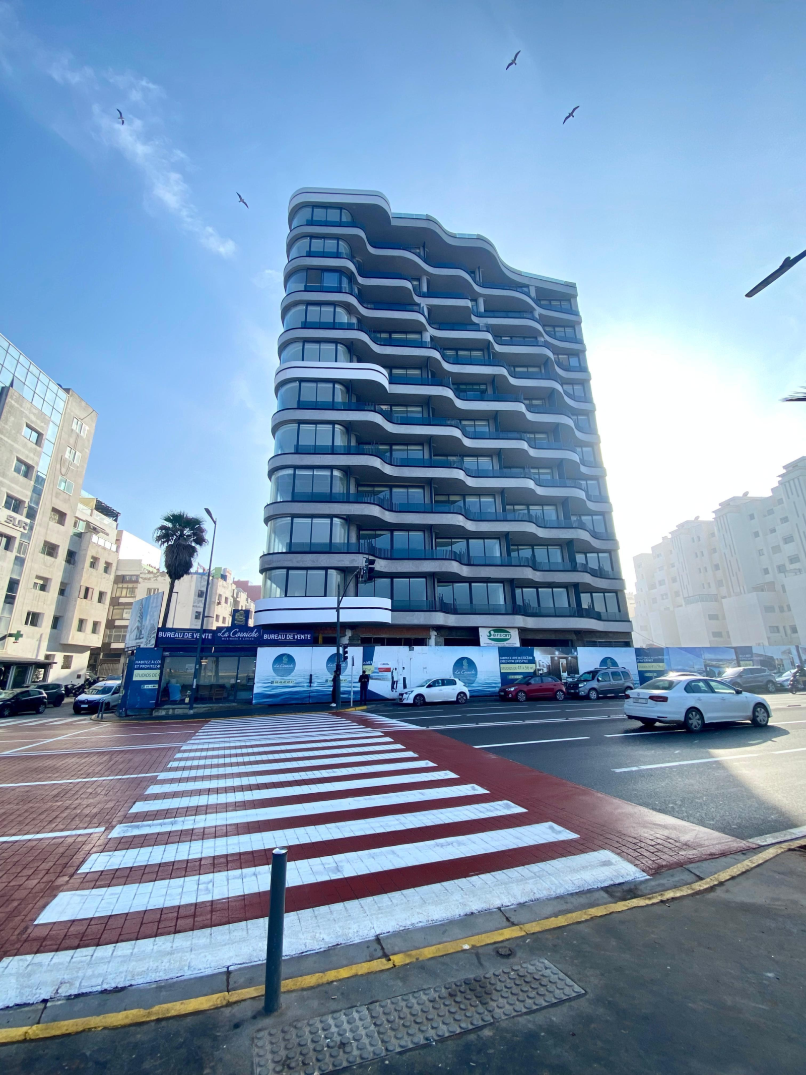 Revêtement au sol, faux plafond et luminaires, climatisation. Ce magnifique bureau est niché dans un immeuble avec une très belle façade vitrée, à la vue imprenable sur la corniche et sur la mosquée Hassan II.