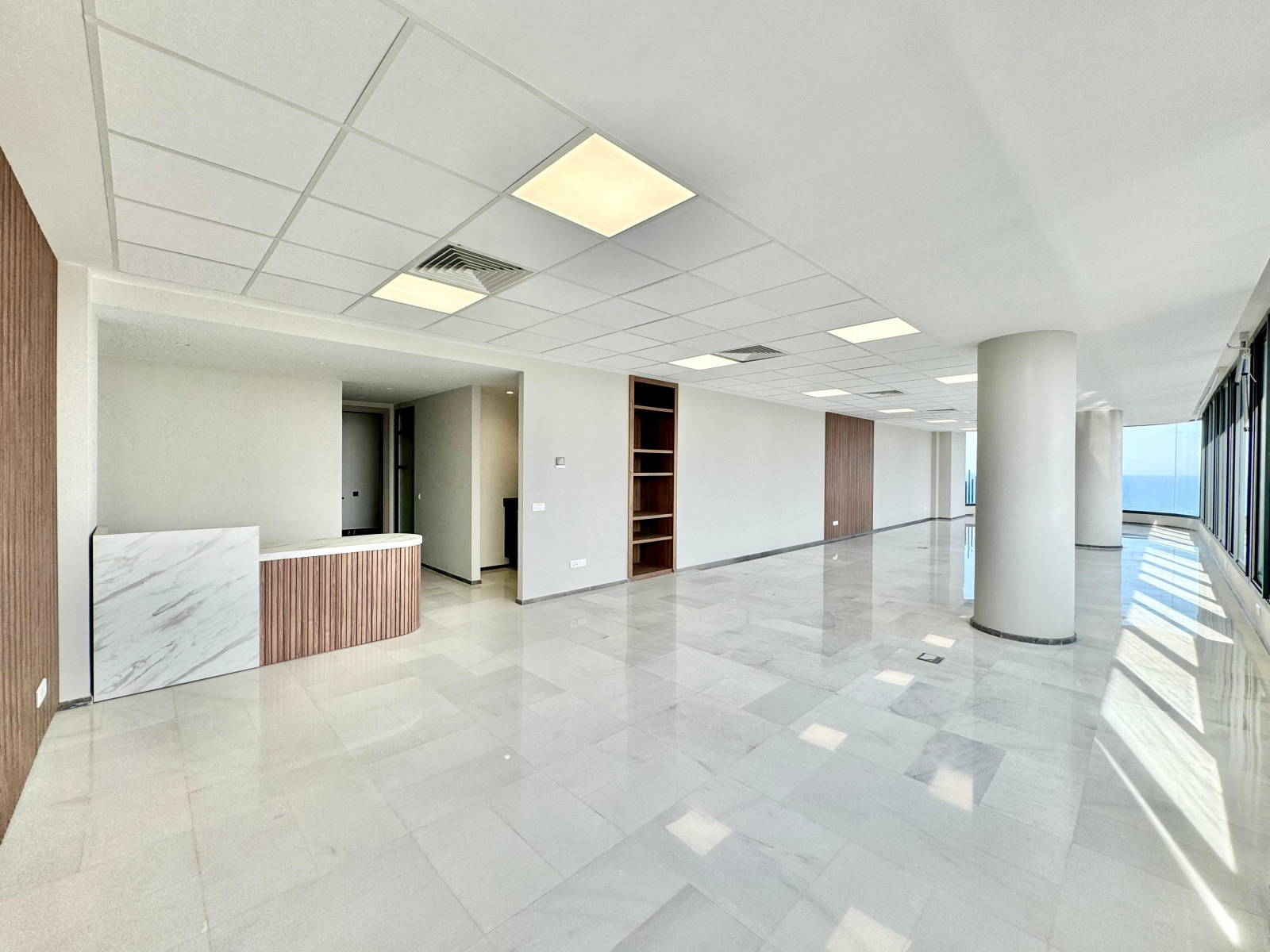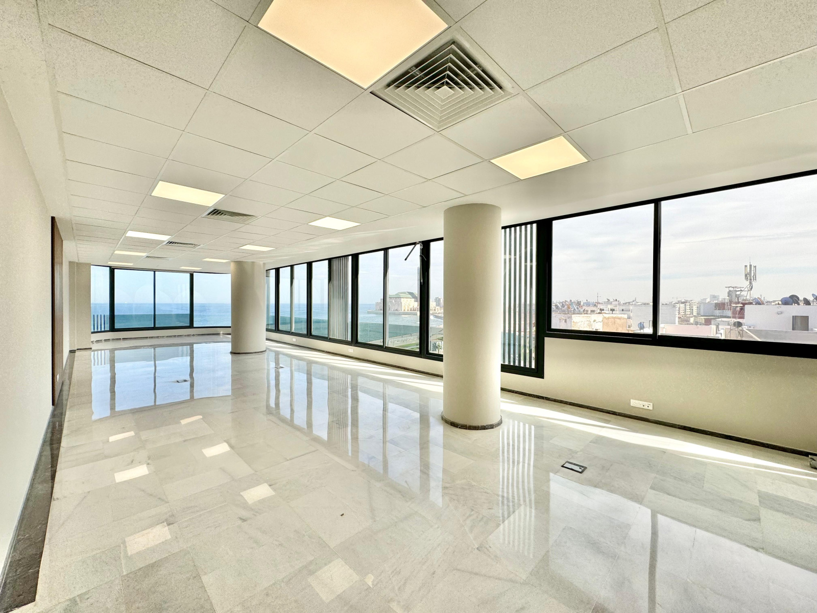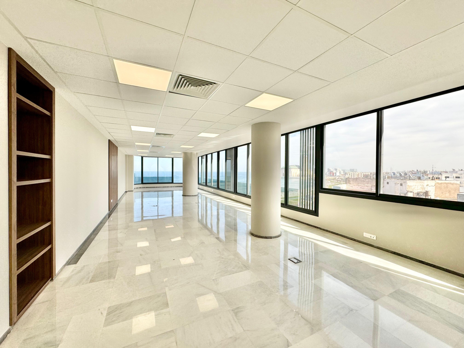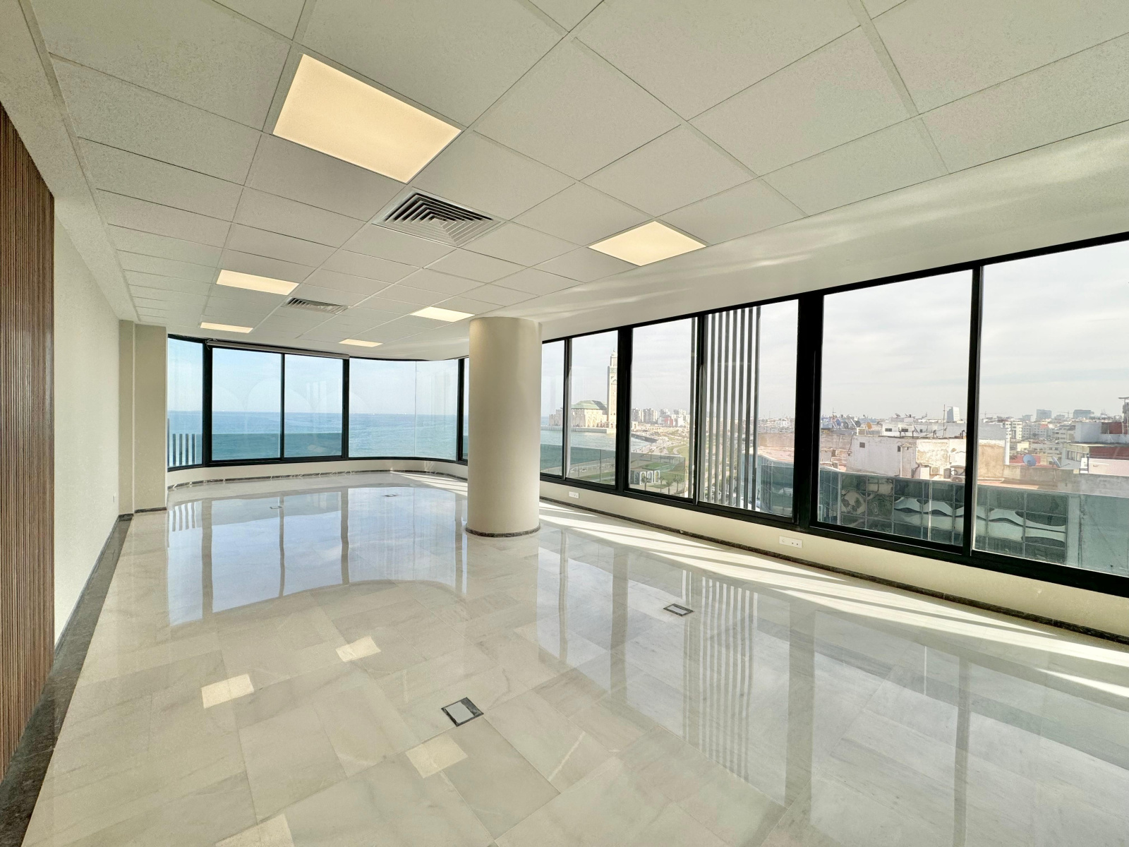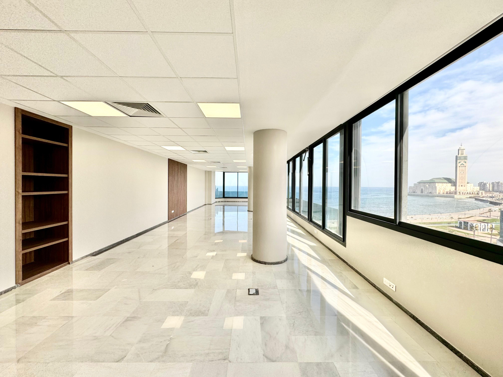 ▪️Une desk d’accueil▪️Une salle d’eau avec toilettes ▪️Un espace kitchenette aménagé ▪️Un grand open space avec vue sur mer et mosquée Hassan II ▪️Une place de parking au sous-sol