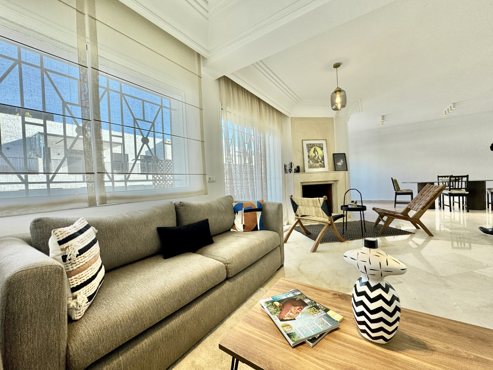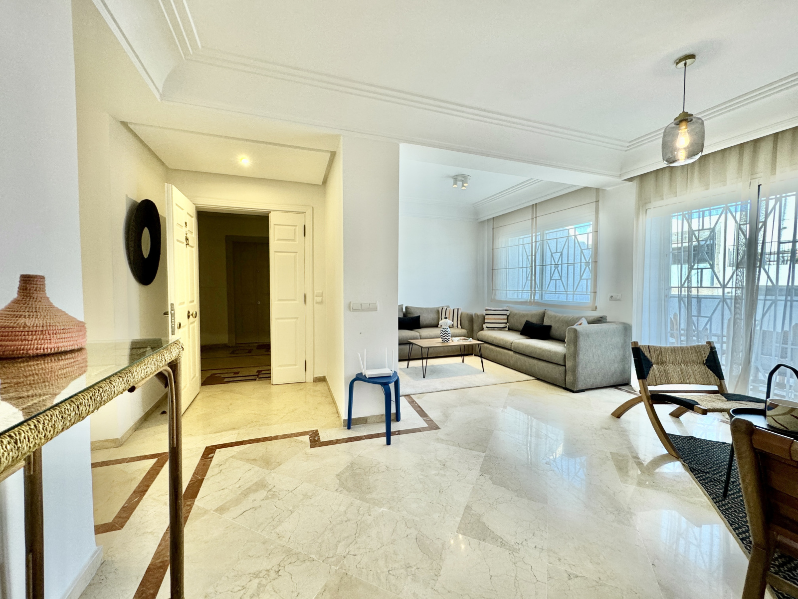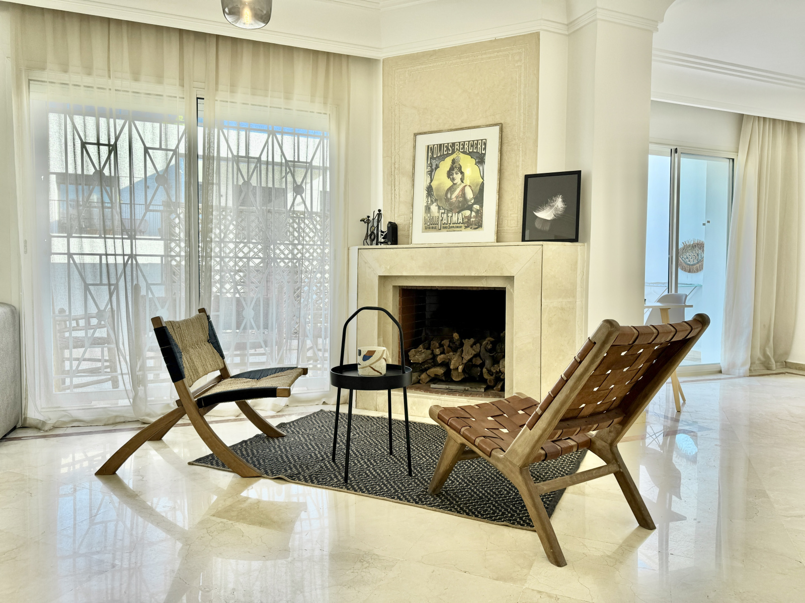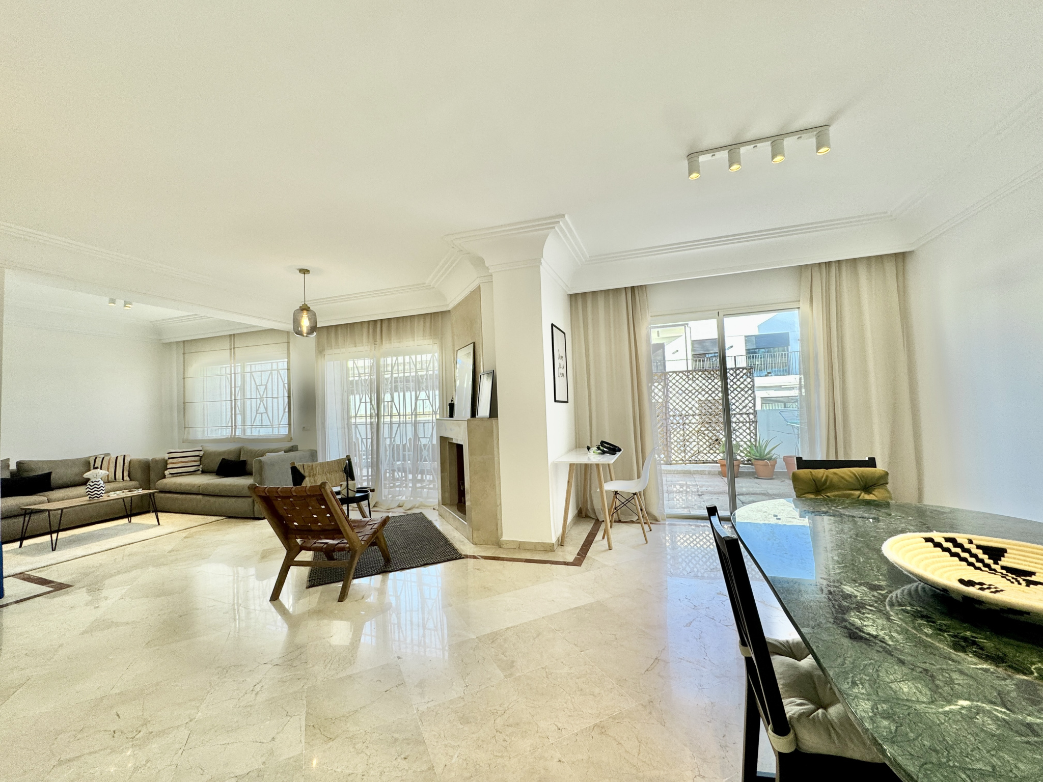 The Agency vous propose un appartement meublé traversant de 106 m², complété par une terrasse de 26 m², situé au dernier étage d’un immeuble sécurisé 24/7, au cœur du Triangle d’Or de Casablanca.