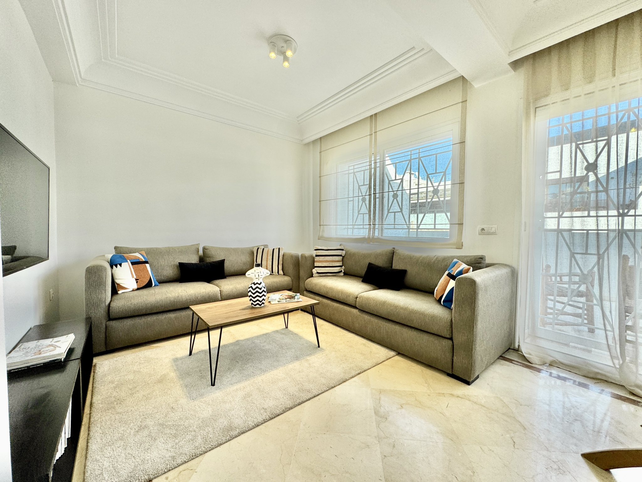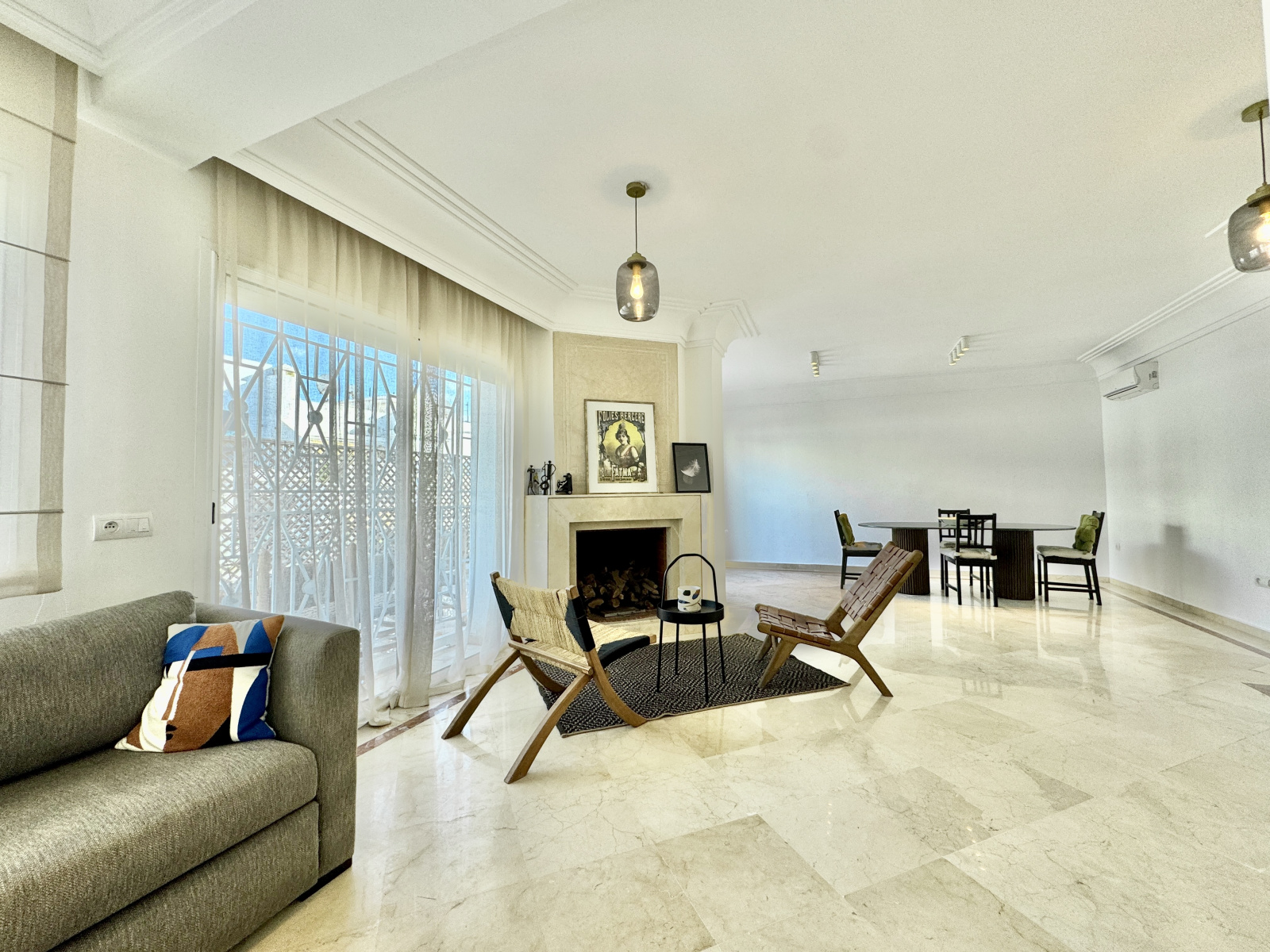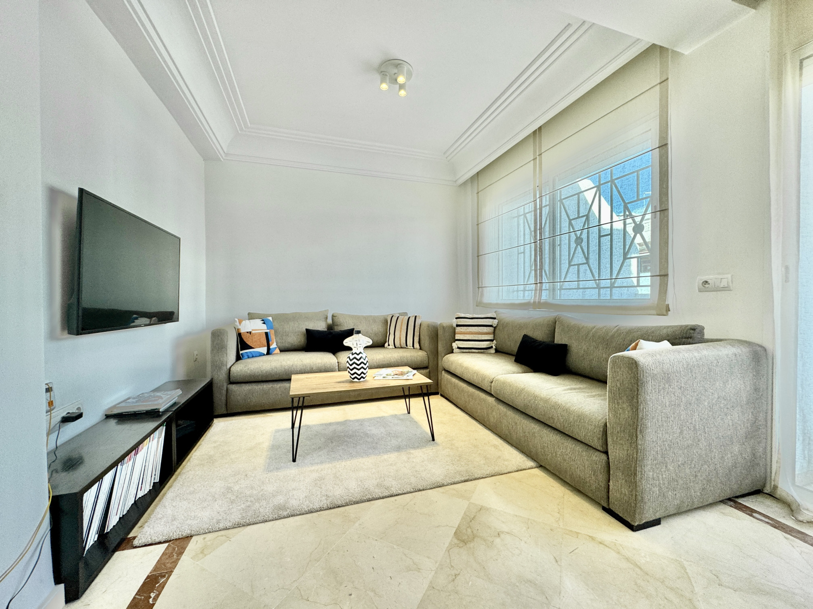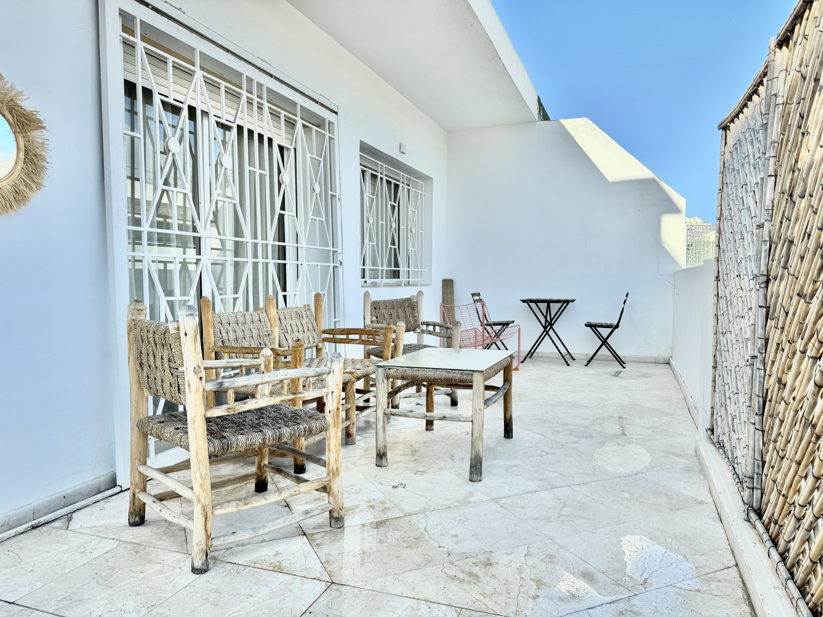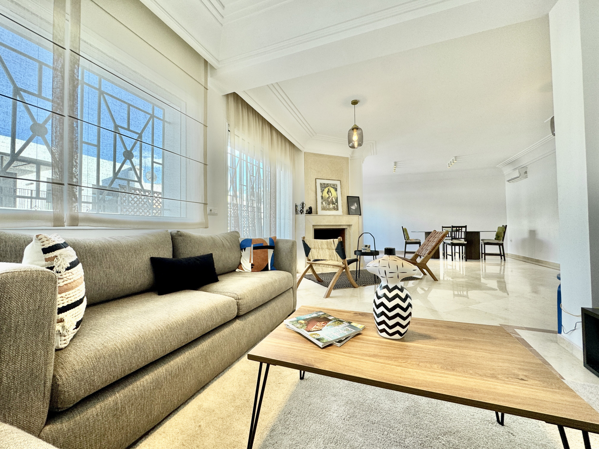 The Agency vous propose un appartement meublé traversant de 106 m², complété par une terrasse de 26 m², situé au dernier étage d’un immeuble sécurisé 24/7, au cœur du Triangle d’Or de Casablanca.