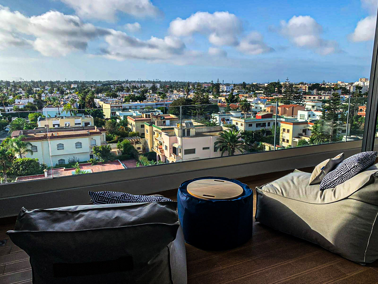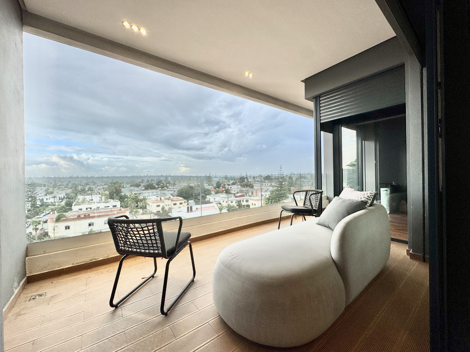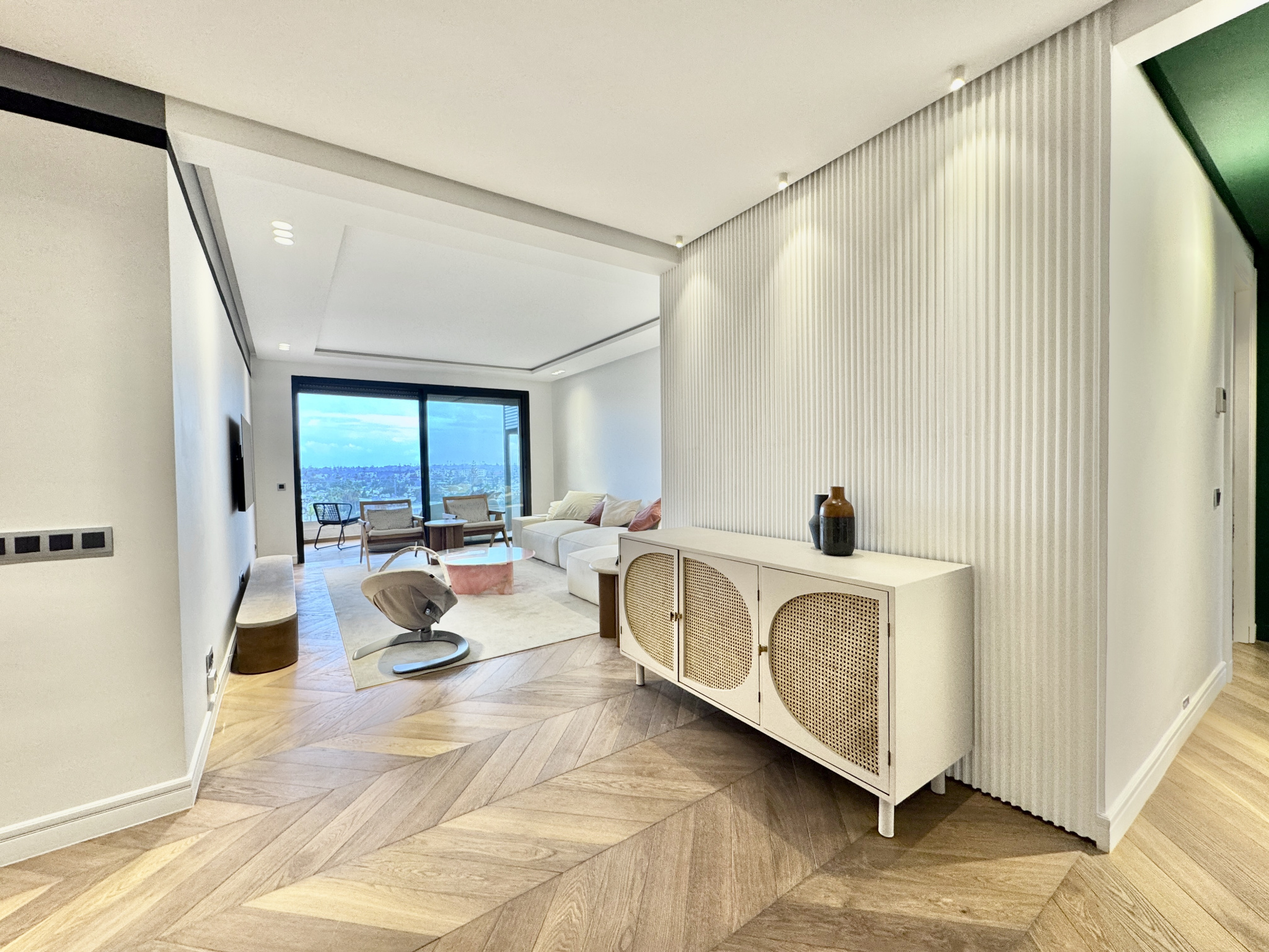 CIL – Appartement meublé à la location – 2 chambres – Terrasse – Traversant Est / Ouest – 5ᵉ et dernier étage – Vue dégagée sur villas – 2 parkings – Résidence de standing – Superficie totale : 135 m²