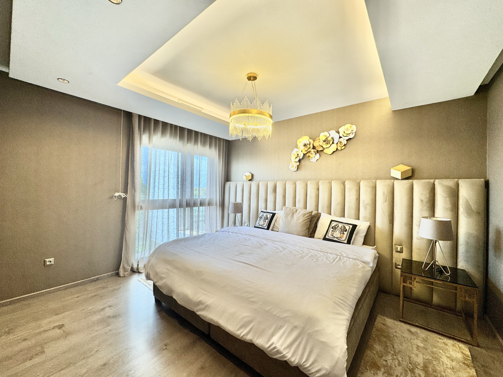 Appartement lumineux, mobilier de qualité, marbre au sol, climatisation, revêtements muraux décoratifs.