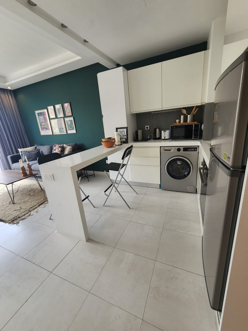 - Une cuisine ouverte entièrement équipée avec comptoir dinatoire