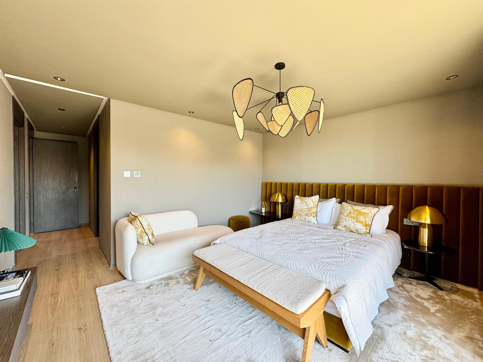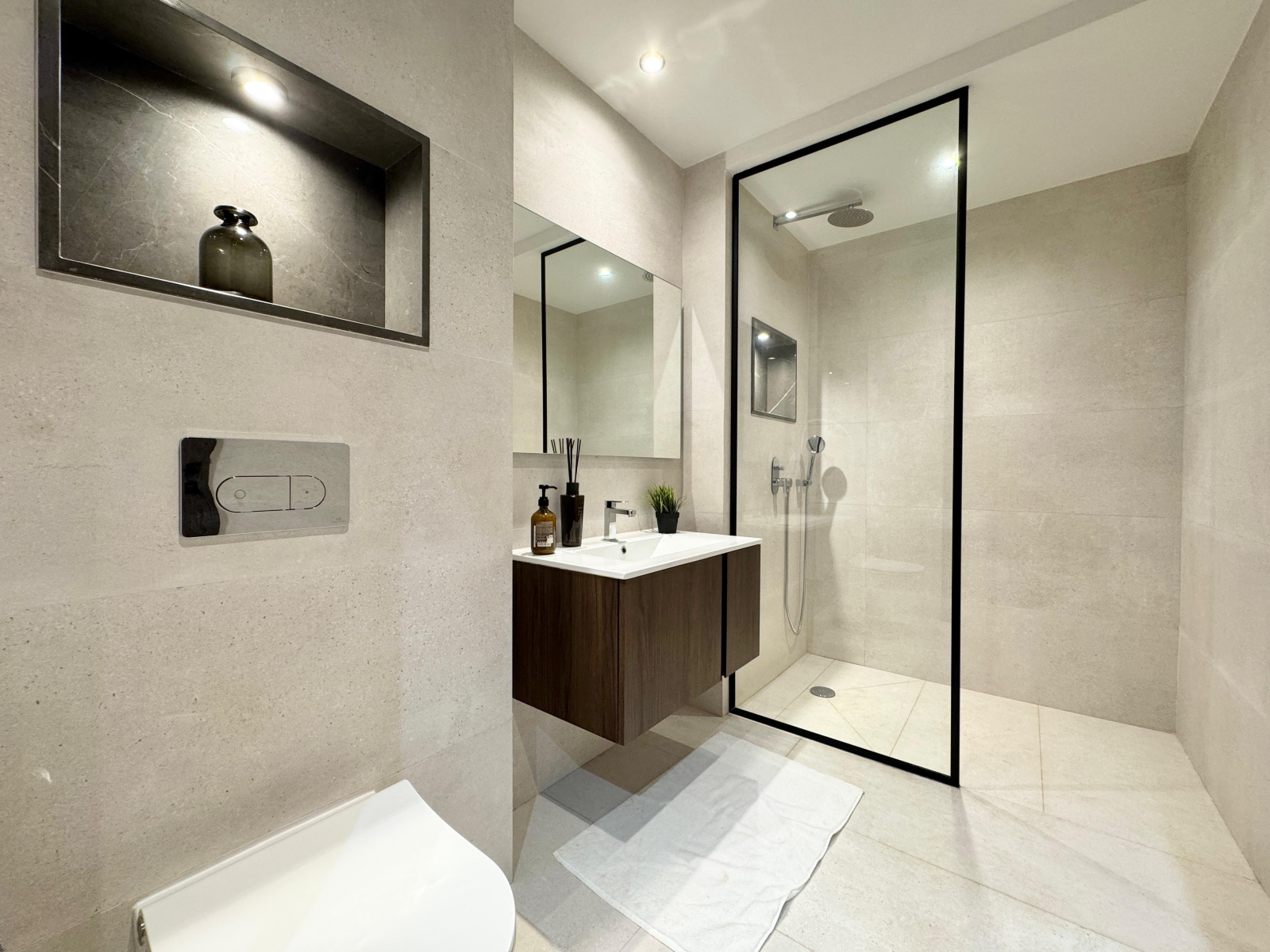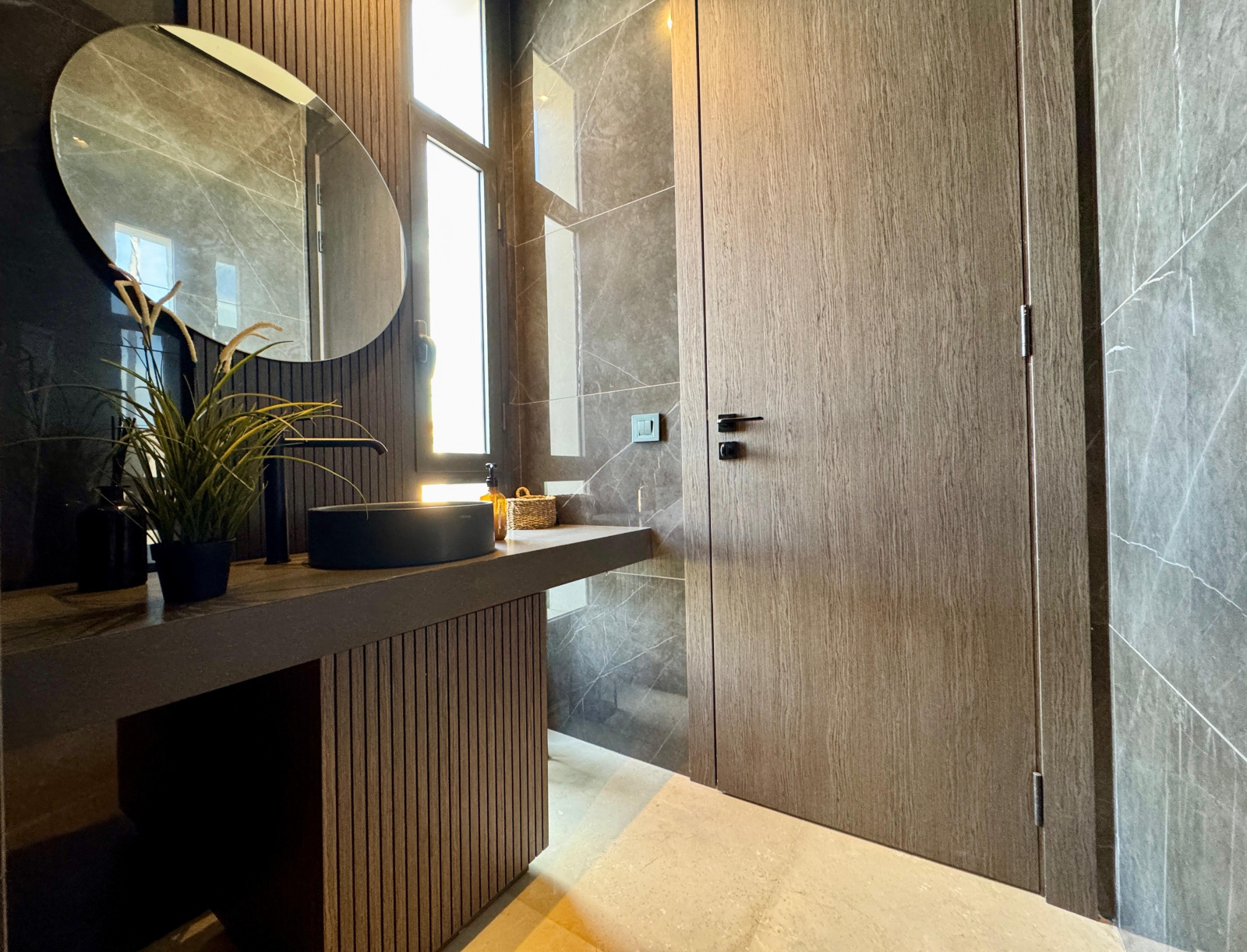 Marbre gris au sol dans les séjours et parquet dans les chambres, climatisation centralisée réversible, salles de bains et sanitaires haut de gamme, etc…