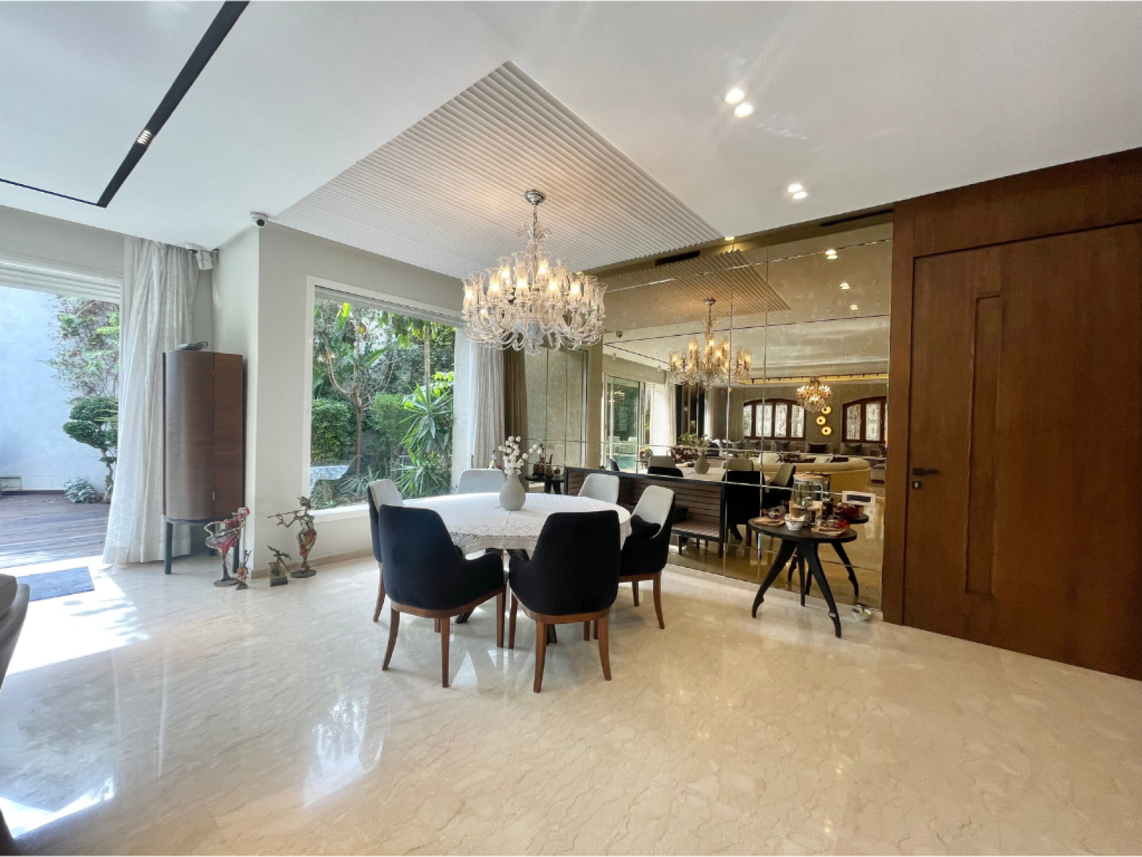 - Une grande réception comprenant trois salons et un espace salle à manger avec cheminée traditionnelle donnant sur un beau jardin avec piscine