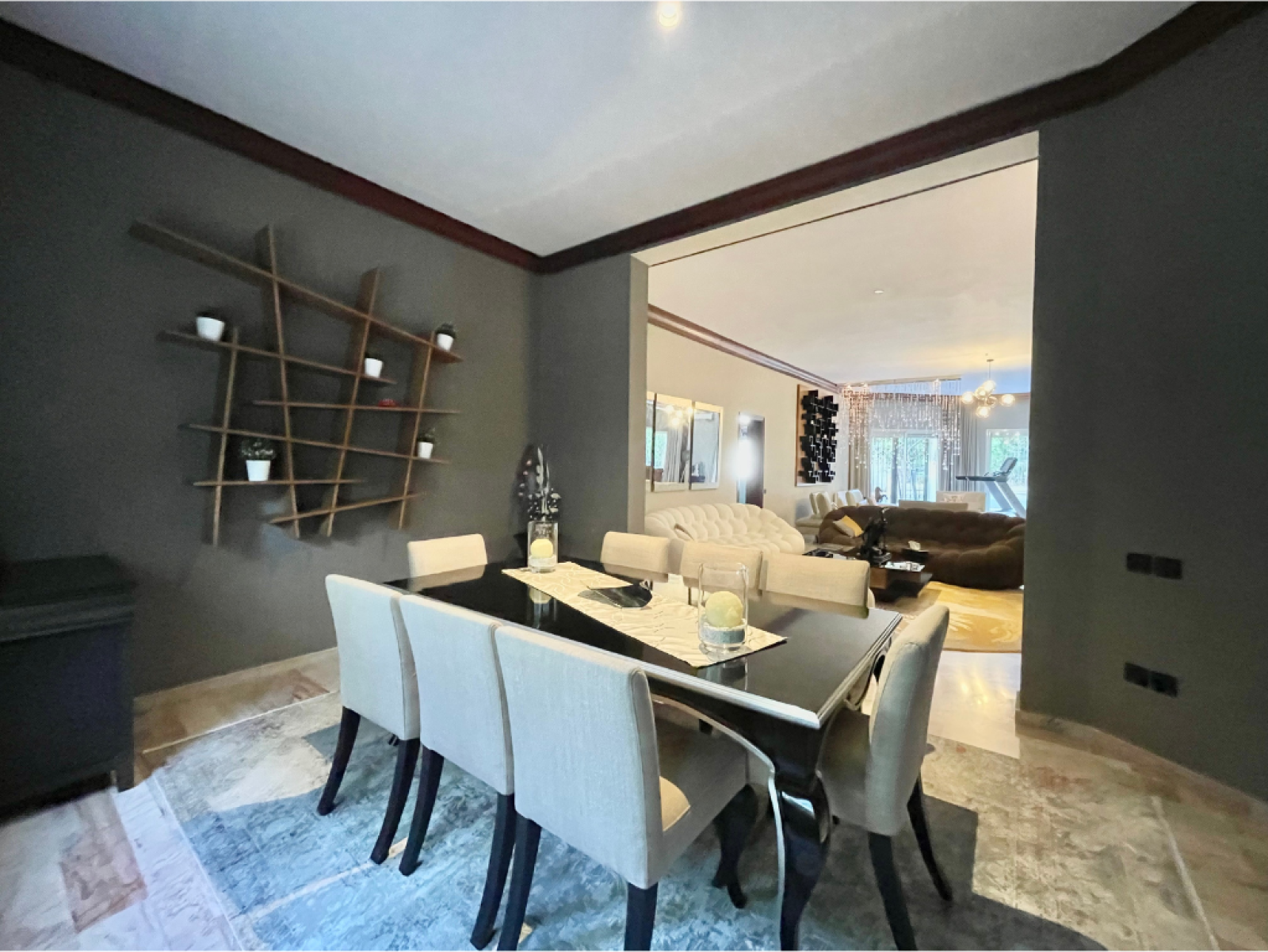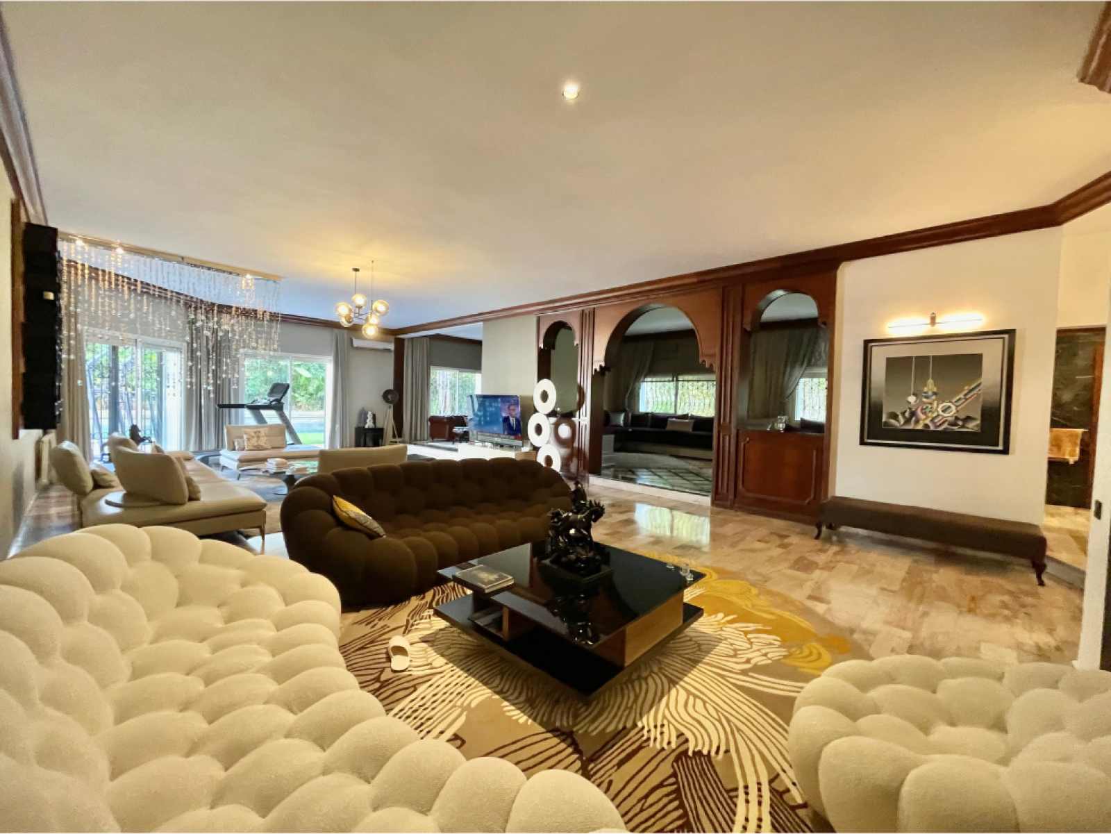 - Une grande réception comprenant un espace salle à manger, un salon marocain et trois salons dont l’un avec cheminée donnant sur un grand jardin avec piscine