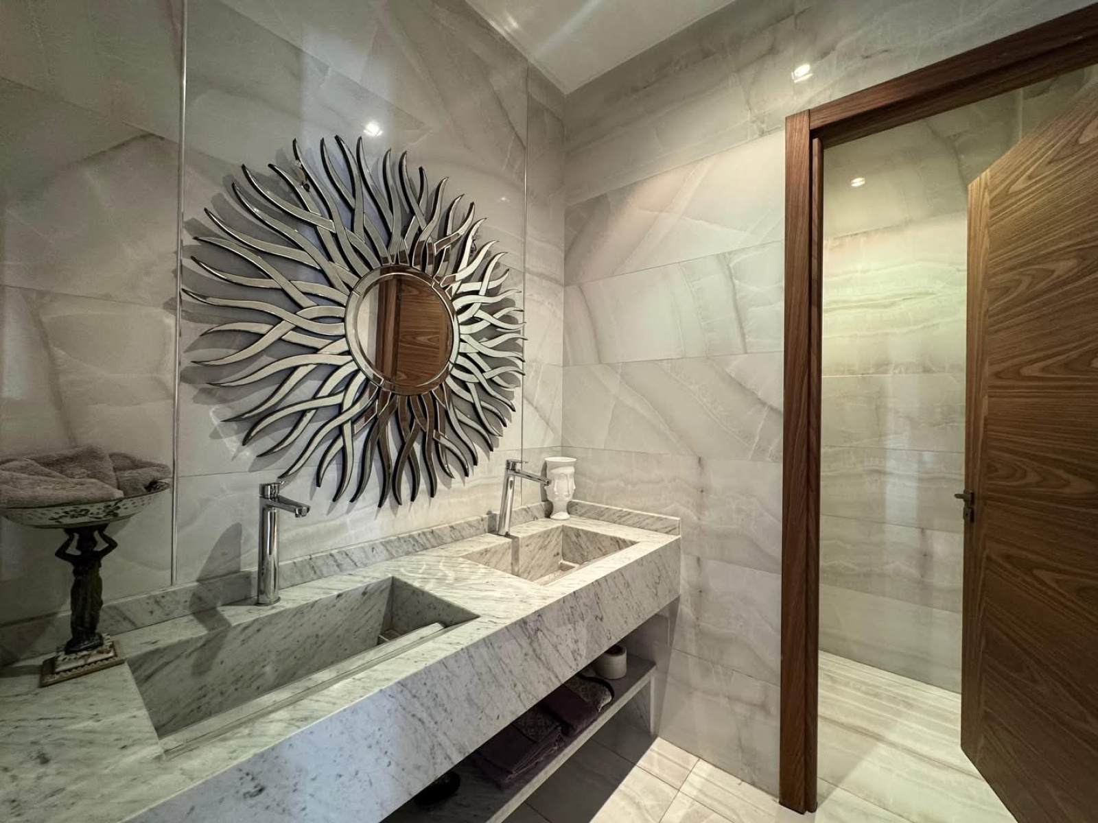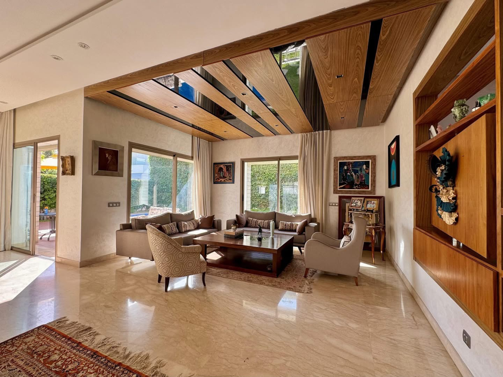 Marbre au sol, carrelage effet parquet dans les chambre, climatisation centralisée.