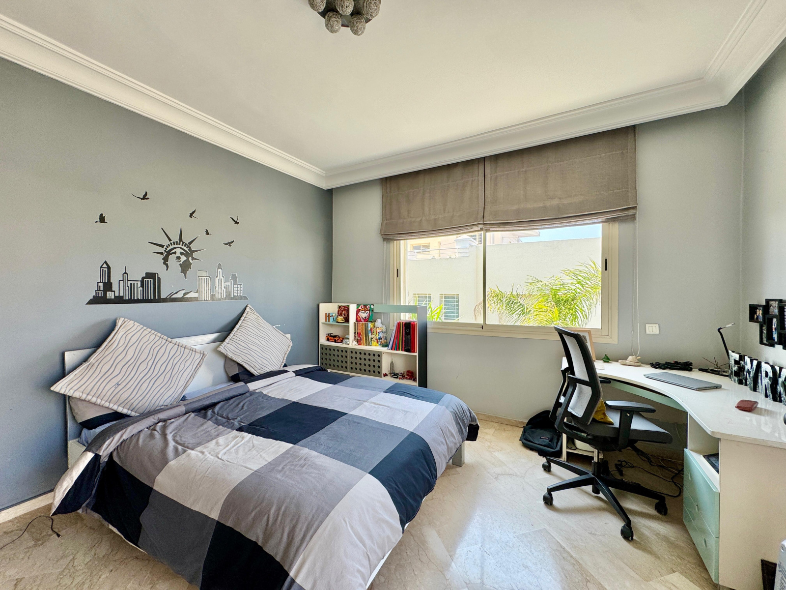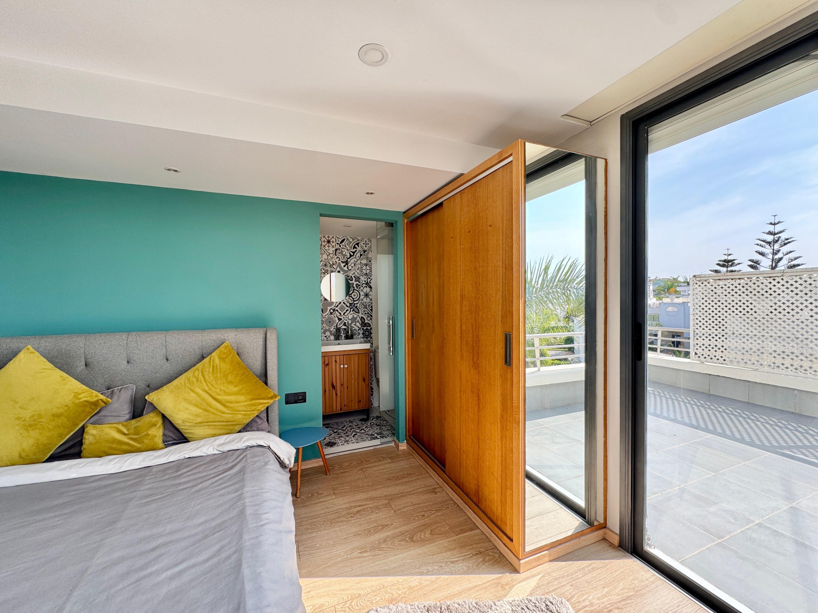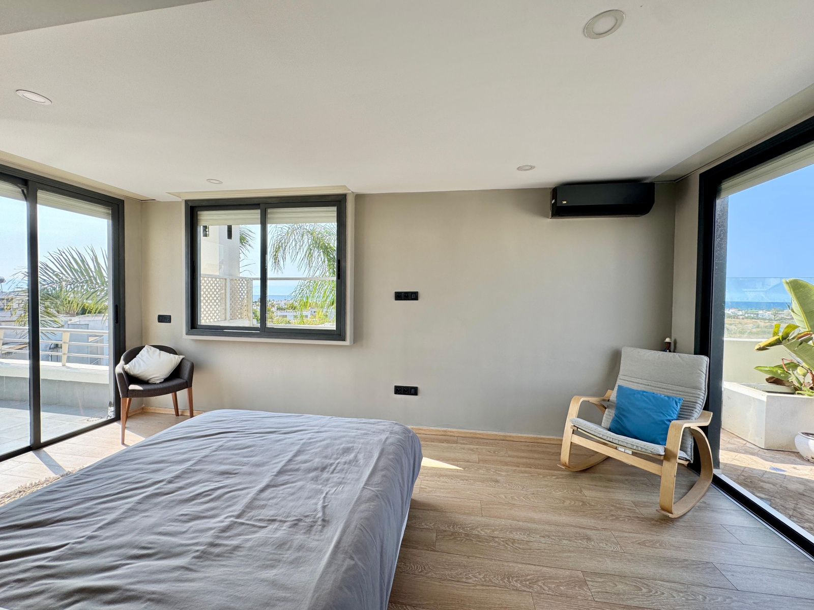 - Une suite junior avec salle de bains avec douche et climatisation par split, parquet au sol et rideaux extrudés